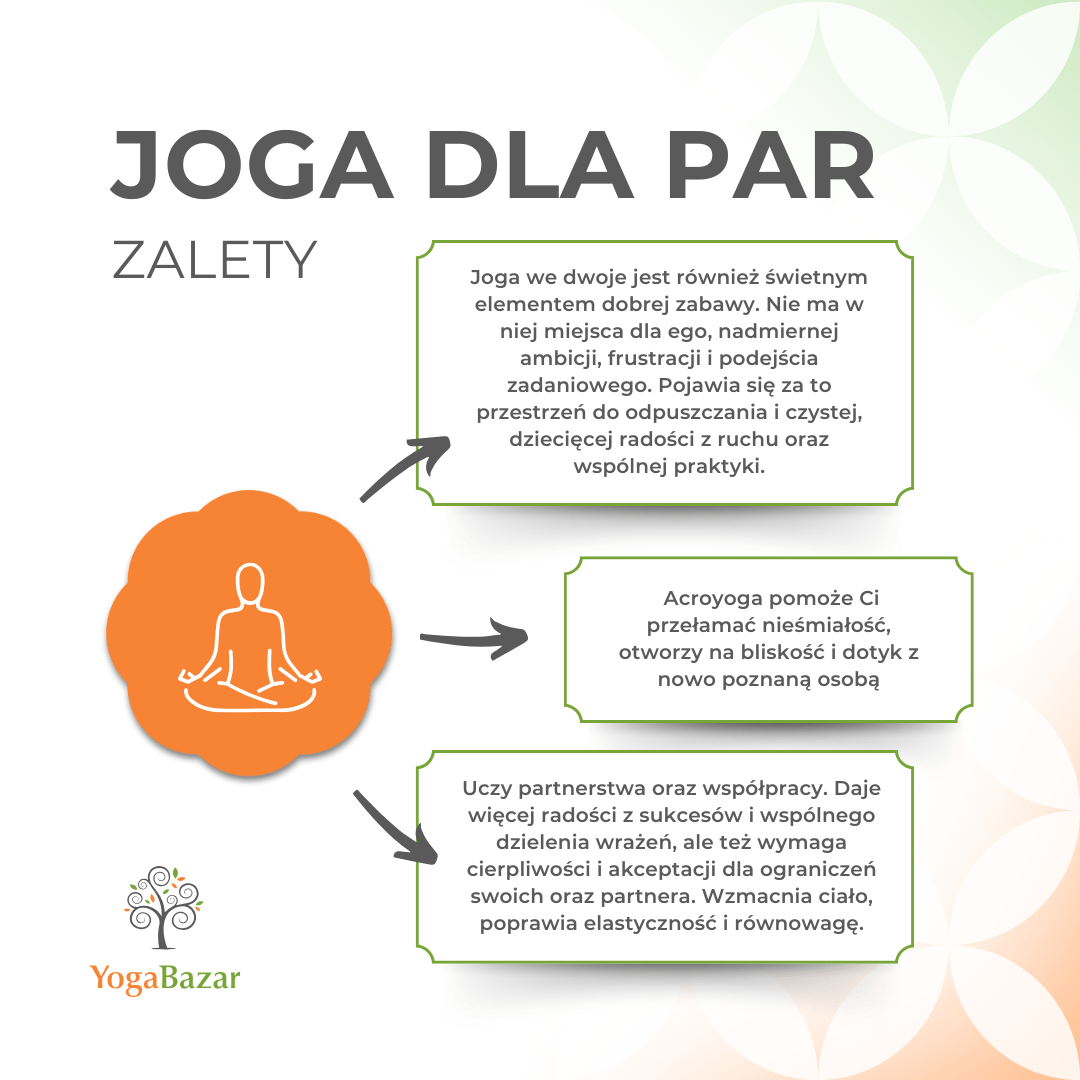 Próbując swoich sił w jodze dla par, szybko przekonasz się, że jest ona doskonałą lekcją komunikacji. Uczy partnerstwa oraz współpracy. Daje więcej radości z sukcesów i wspólnego dzielenia wrażeń, ale też wymaga cierpliwości i akceptacji dla ograniczeń swoich oraz partnera. W ten sposób Acroyoga rozszerza granice uważności – nie skupiamy się w niej tylko na sygnałach płynących z własnego ciała, ale też uwrażliwiamy się na to, co odczuwa partner. To z kolei rodzi poczucie odpowiedzialności za drugą osobę.