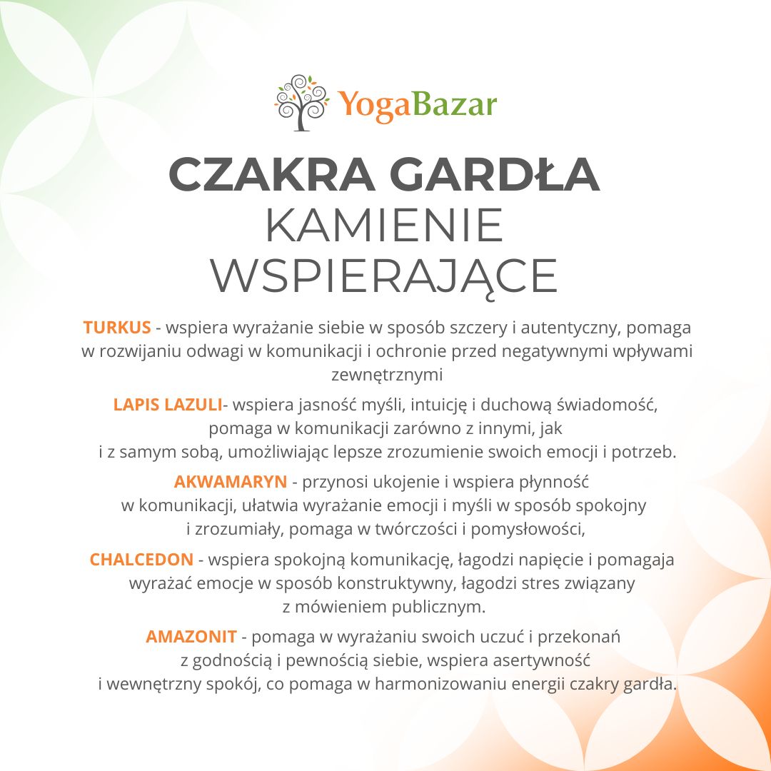 - Amazonit - Znany jako „kamień prawdy i równowagi”, amazonit pomaga w wyrażaniu swoich uczuć i przekonań z godnością i pewnością siebie. Wspiera asertywność i wewnętrzny spokój, co pomaga w harmonizowaniu energii czakry gardła.