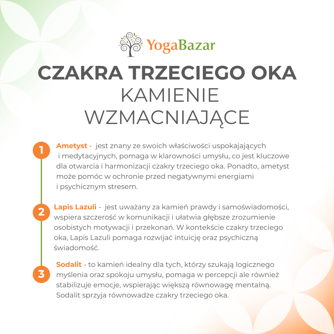 Regularne noszenie kamieni takich jak Ametyst, Lapis Lazuli czy Sodalit w formie biżuterii lub trzymanie ich w miejscach, gdzie spędzasz dużo czasu (np. przy biurku), może pomóc w utrzymaniu aktywnej i zdrowej czakry trzeciego oka.