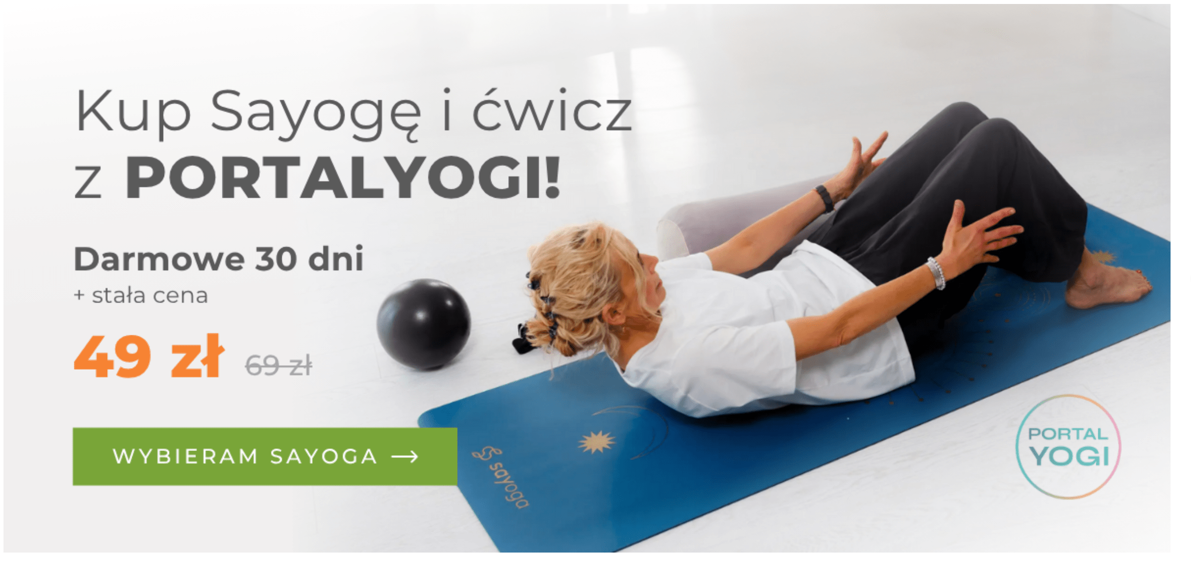 Wspólnie z PortalYogi przygotowaliśmy niezwykłą promocję. Jeśli kupisz dowolny produkt Sayoga, otrzymasz 30 dni bezpłatnego dostępu do platformy PortalYogi oraz zniżkę na dalszą subskrypcję (49 zł zamiast 69 zł). Szczegóły oferty dostępne są w regulaminie promocji.