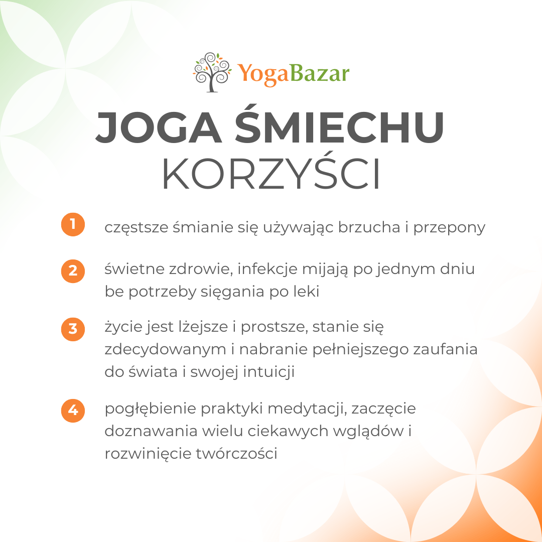 Co dobrego daje ta metoda? Tutaj świadectwo każdej osoby jest trochę inne, tak samo jakby było w wypadku badań efektów praktyki hatha jogi. Zacznę od tego co jest dla mnie najłatwiej dostępne czyli własnych doświadczeń. Moje doświadczenie jest na tyle bogate, że potrzebowałem napisać książkę, aby podzielić się nim ze światem, niemniej mogę pokusić się o nazwanie największych korzyści. Zacznę do tych najłatwiej uchwytnych – dzięki codziennej praktyce zacząłem się śmiać częściej i głębiej używając brzucha i przepony. Mój gardłowy, tłumiony śmiech naprawdę stał się pełniejszy, dłuższy, przepełniony wibracjami wolności. Ba, przestałem wymagać wiele by zacząć się śmiać, po prostu wykonywałem specjalne ćwiczenia na zasadzie porannej praktyki gimnastycznej, co ułatwiło mi by w ciągu dnia dostrzegać pozytywy i bodźce do śmiechu choćby uśmiechu w postaci choćby błysku w oczach małego dziecka spotkanego gdzieś po drodze lub wesołego merdania ogonem psa. Odkąd podjąłem się praktyki doświadczam świetnego zdrowia, a wszelkie infekcje mijają po jednym dniu be potrzeby sięgania po leki. To dopiero początek transformacji, bo doznałem dzięki jodze śmiechu takiego uczucia, że nagle wszystkie moje życiowe „kropki” łącza się w całość. Poczułem, że praktyka i prowadzenie zajęć przychodzą mi zupełnie naturalnie tak jakbym był do tego stworzony, tak jakbym zbliżył się do odnalezienia mojego powołania.Sprawdź naszą ofertę mat do jogi!