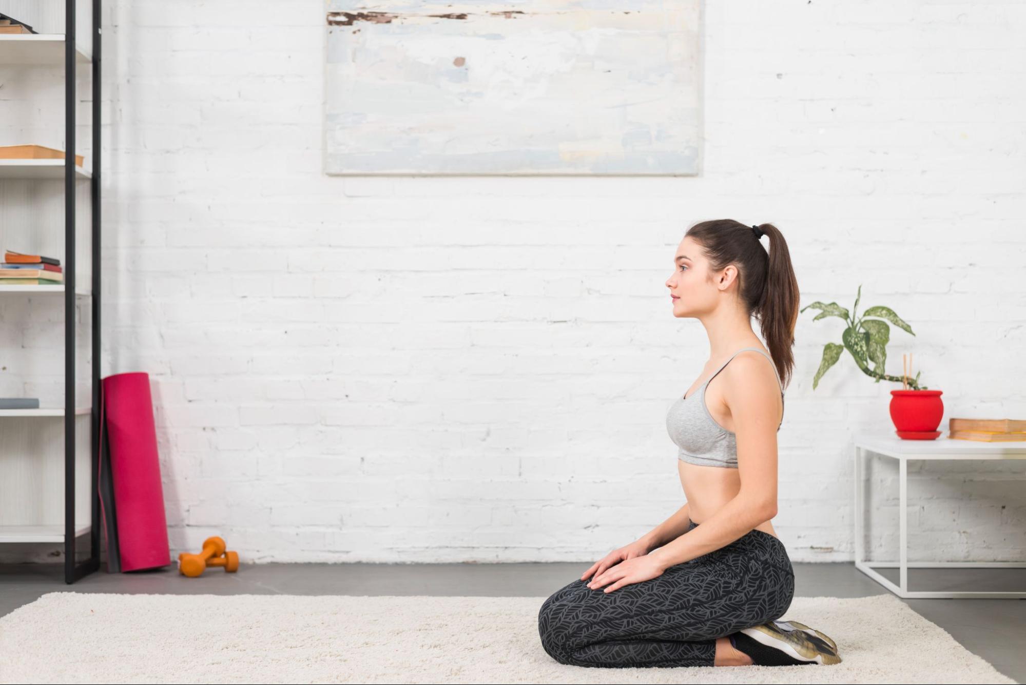 Usiądź na piętach, kolana razem. To pozycja wspierająca uważność i koncentrację – często stosowana do praktyki oddechowej lub mantr.
