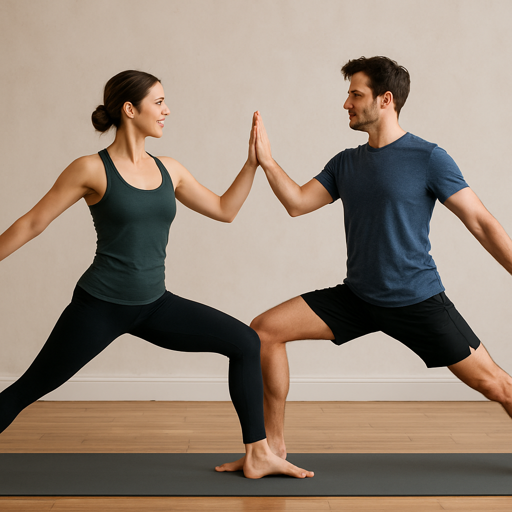 Partnerzy stoją naprzeciwko siebie w Wojowniku II, dotykając się dłonią do dłoni. Równowaga, siła i kontakt wzmacniają nie tylko ciało, ale i relację.
