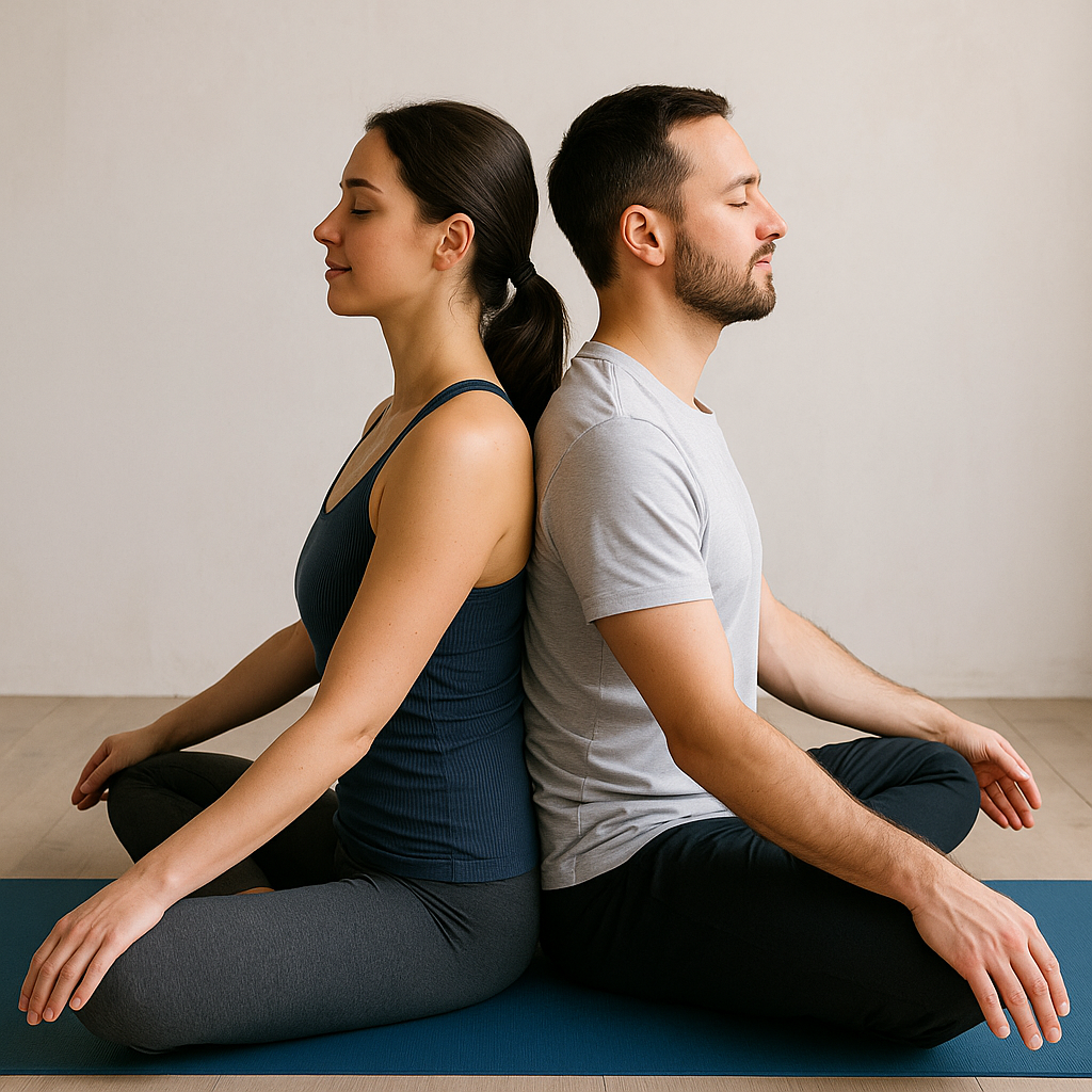 Usiądźcie plecami do siebie, zsynchronizujcie ruchy i oddechy – np. w skłonie do przodu na wdechu, powrót na wydechu. To harmonizuje energię i pogłębia obecność.