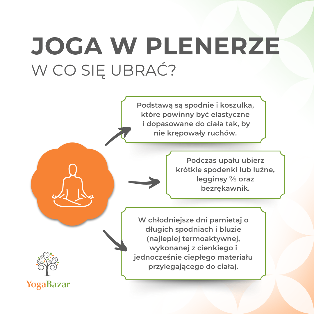 Podczas upału możesz natomiast postawić na krótkie spodenki lub luźne, legginsy ⅞ oraz bezrękawnik. Pomimo wysokiej temperatury miej jednak bluzę (lub ciepły koc) zawsze przy sobie – przyda się, gdy intensywna joga na świeżym powietrzu zakończy się dłuższą relaksacją, a rozgrzane ciało powoli zacznie tracić ciepło.