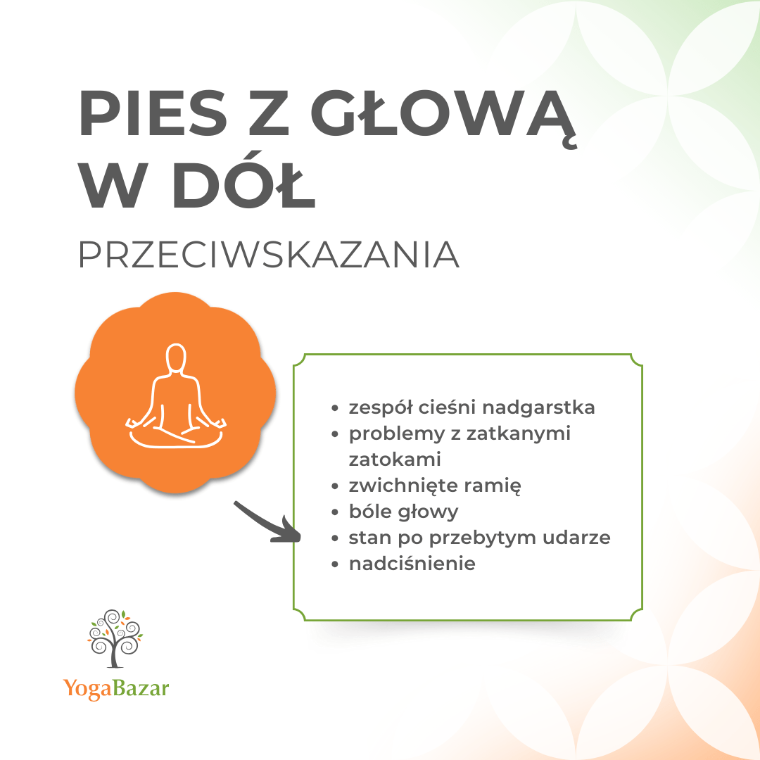 Jak każda aktywność fizyczna, również wykonywanie pozycji psa z głową w dół, nie zawsze jest możliwe. Głównymi przeciwwskazaniami do praktykowania tej asany są: