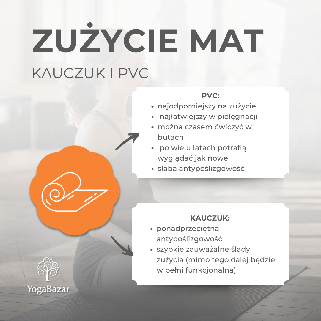 PVC to materiał zdecydowanie najodporniejszy na zużycie. Jest najłatwiejszy w pielęgnacji i wybacza najwięcej "nadużyć" ze strony użytkownika. Na macie z PVC można czasem nawet ćwiczyć w butach (np. fitness czy pilates) bez większego stresu o uszkodzenie maty. Maty do jogi tego typy nawet po wielu latach potrafią wyglądać jak nowe. Jest to materiał tak trwały, że Manduka daje na swoje maty z PVC dożywotnią gwarancję na zużycie. Dzięki temu takie maty świetnie zniosą nawet intensywną praktykę Ashtangi lub Vinyasy. Minusem PVC jest to, że musi się on "dotrzeć" na początku praktyki, aby osiągnąć optymalną antypoślizgowość, a nawet wtedy nie będzie ona aż tak wysoka jak antypoślizgowość szorstkiej maty kauczukowej.Maty z naturalnego kauczuku