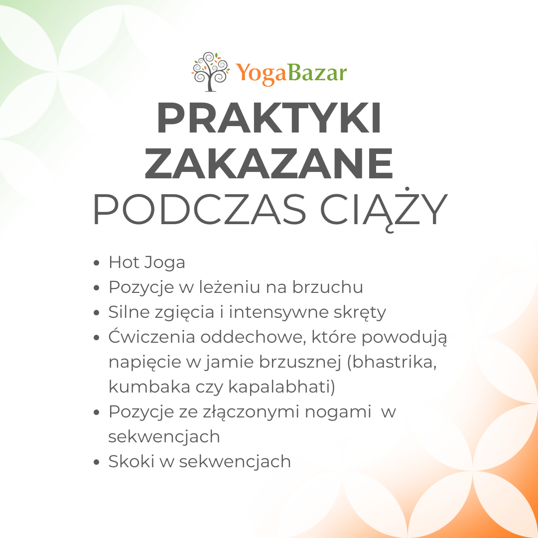 Kobietom w ciąży odradza się praktykowanie hot jogi i odmian dynamicznych. Gimnastyka dla ciężarnych wyklucza też ćwiczenia wymagające ściskania pachwin i brzucha oraz napinania jego mięśni. Z tego powodu za ćwiczenia zakazane w ciąży uznaje się pozycje w leżeniu na brzuchu, silne zgięcia i intensywne skręty, a także ćwiczenia oddechowe, które powodują napięcie w jamie brzusznej (bhastrika, kumbaka czy kapalabhati). Staraj się też nie wykonywać pozycji ze złączonymi nogami, tylko rozstaw je przynajmniej na szerokość bioder. Ponadto unikaj skoków w sekwencjach. Możesz zamienić je na wolne, spokojne przejścia lub zrezygnować z wymagających skakania asan. W dodatku, jeśli praktykę rozpoczynasz dopiero w ciąży, naukę pozycji odwróconych pozostaw na czas po porodzie. Z kolei doświadczone joginki powinny zaprzestać wchodzenia w te asany w III trymestrze.